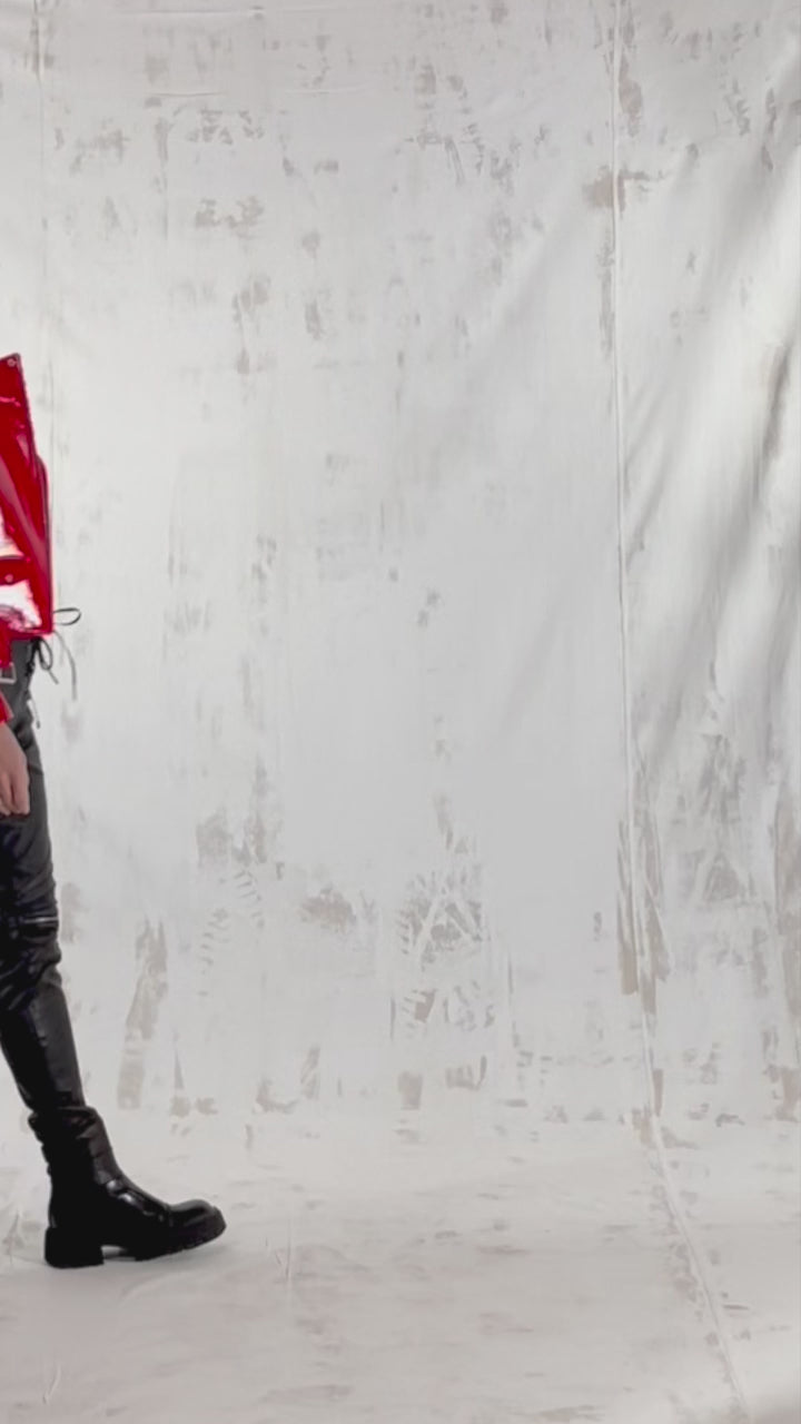 Encapsulate Milana Bartolotta’s signature aesthetic with this red patent leather jacket, which riffs on traditional motorcycle silhouettes. It’s crafted in New York City to a fitted silhouette with epaulettes and notched lapels adorned with silver studs, then features two zip pockets. The glossy and structured qualities of this leather give a more polished look to otherwise edgy silhouette.