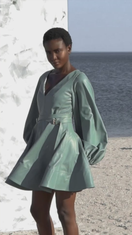 Rock the scene in this chic dress with voluminous lantern sleeves, a hidden snap cuff, and a flattering fit & flare cut. The silver tone Lampo zipper at the back, along with the double-wrapped belt and horsehair trim at the hem, adds a cool edge. It's the perfect mix of playful and elegant, ready to make a bold statement.
